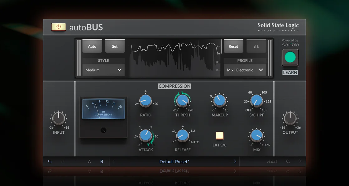 Modelled on what is arguably the most coveted production tool ever created, the Bus Compressor from the legendary SSL 4000 G console, autoBUS analyses your audio, presents adaptive profile‑based, style‑matched settings, and instantly delivers mix bus or subgroup processing that remains fully editable. The sound of the 4000 G transcended genres, embraced by legendary engineers and producers including Tom Lord Alge, Bob Rock, and MixedByAli, and used by artists including Springsteen, Pink Floyd, Nirvana, and Massive Attack. autoBUS’ AI assistance provides optimisation processing for whatever genre a user may be working in, as well as offering intelligent Full Mix, Vocal, Guitar and Drum bus profiles, giving you even more tailored options for different elements of your production.